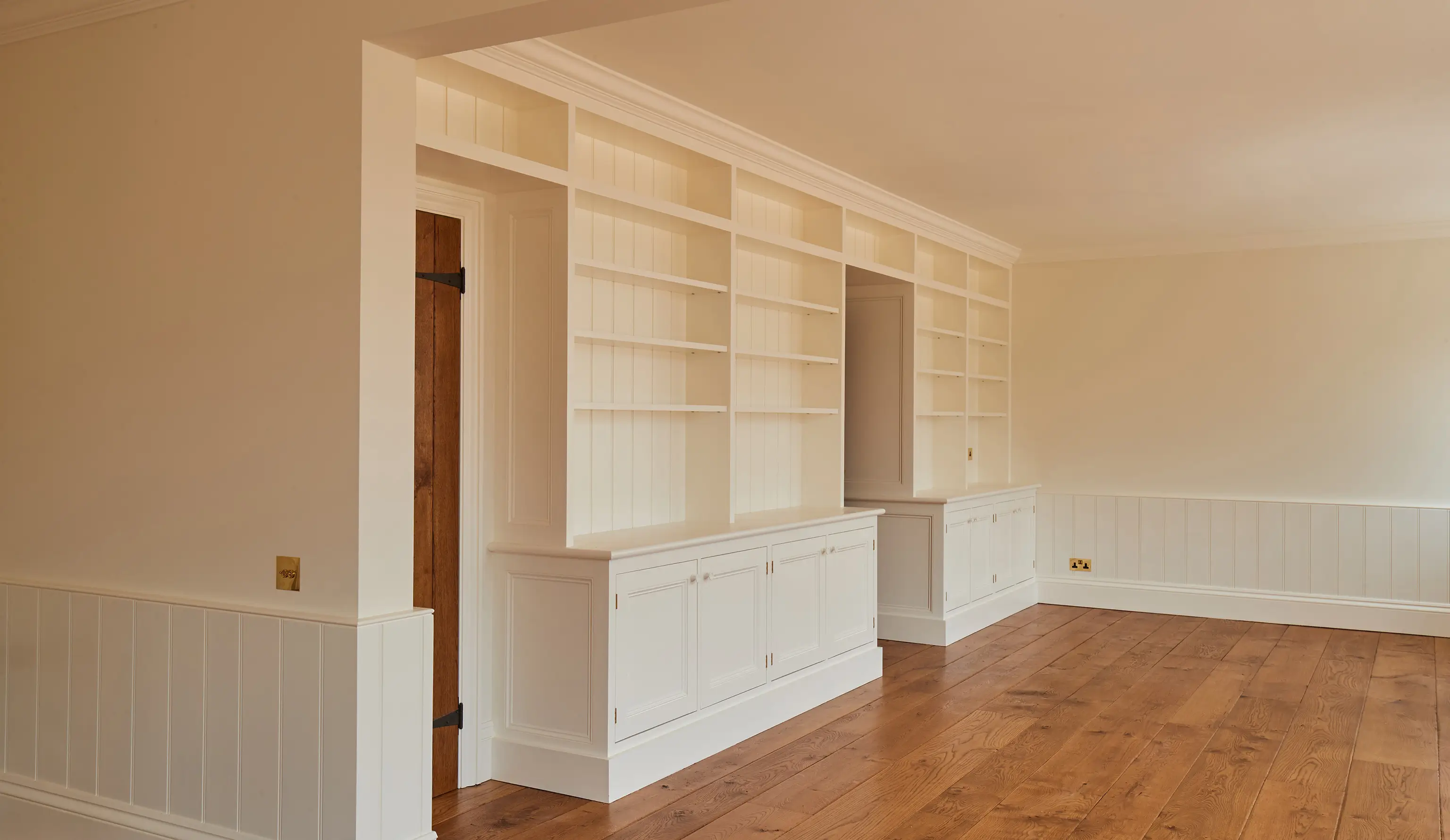 This project involved a full joinery fit out for the Grade II listed farmhouse, dairy cottage, pool barn, and outbuildings. Works included a bespoke boot room, large external barn doors, and seamlessly integrating an existing listed corner unit into new bookshelves.